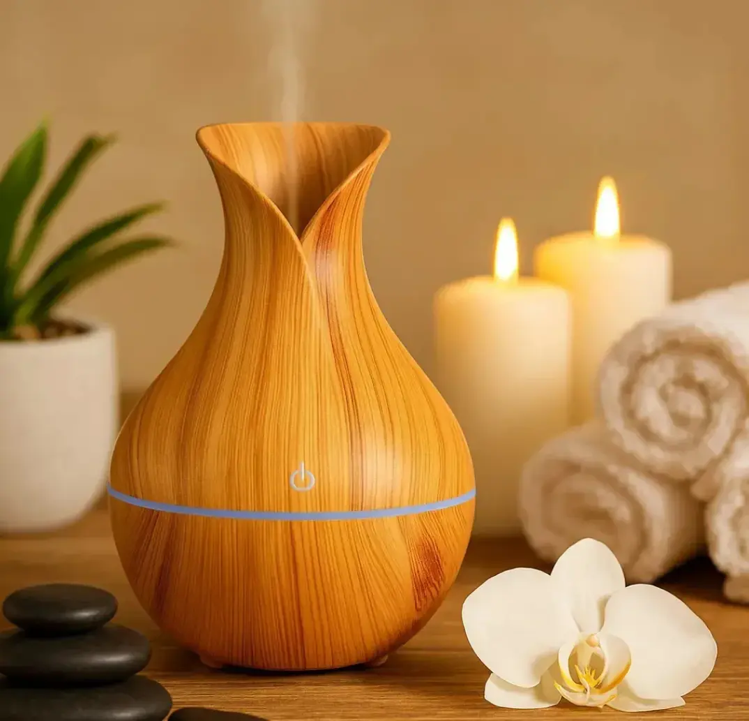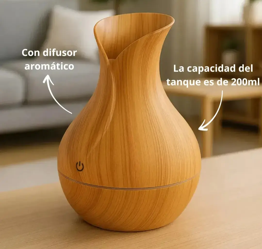 El humidificador de 200 ml ha sido diseñado para brindar una experiencia completa de confort, salud y bienestar en cualquier ambiente. Su diseño con acabado en imitación madera le da un estilo moderno y elegante, que no solo cumple una función práctica, sino que también se integra como un accesorio decorativo en el hogar, la oficina o espacios de relajación.