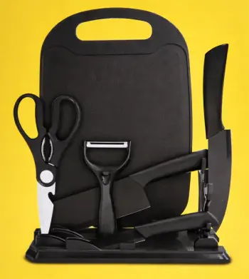 Incluye: 3 cuchillos, tijera, pelador y tabla